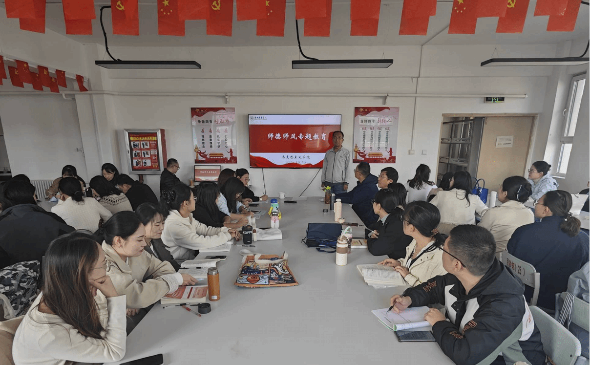 2025年10月15日下午,马克思主义学院组织全体教师集中开展师德师风建设专题教育,并结合学院工作实际,对后续师德师风建设工作作出具体部署。