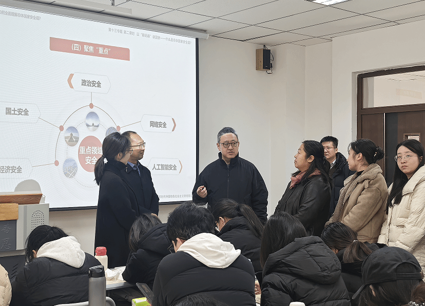 交流活动的首站设在7教404,这里正在进行富有特色的“思政会课厅”活动。我校青年教师侯苗苗以其扎实的理论功底、精心的教学设计和富有感染力的讲授,将“总体国家安全观”这一宏大的理论主题,转化为贴近学生思想实际、认知水平和兴趣关切的教学内容。