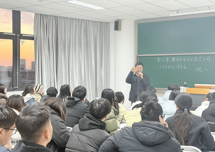 常务副校长胡继连巧妙引用教材内容,穿插案例与数据,将理论知识与现实问题紧密结合。课堂氛围轻松活跃,学生们听得津津有味,不时举手提问,展开互动交流。