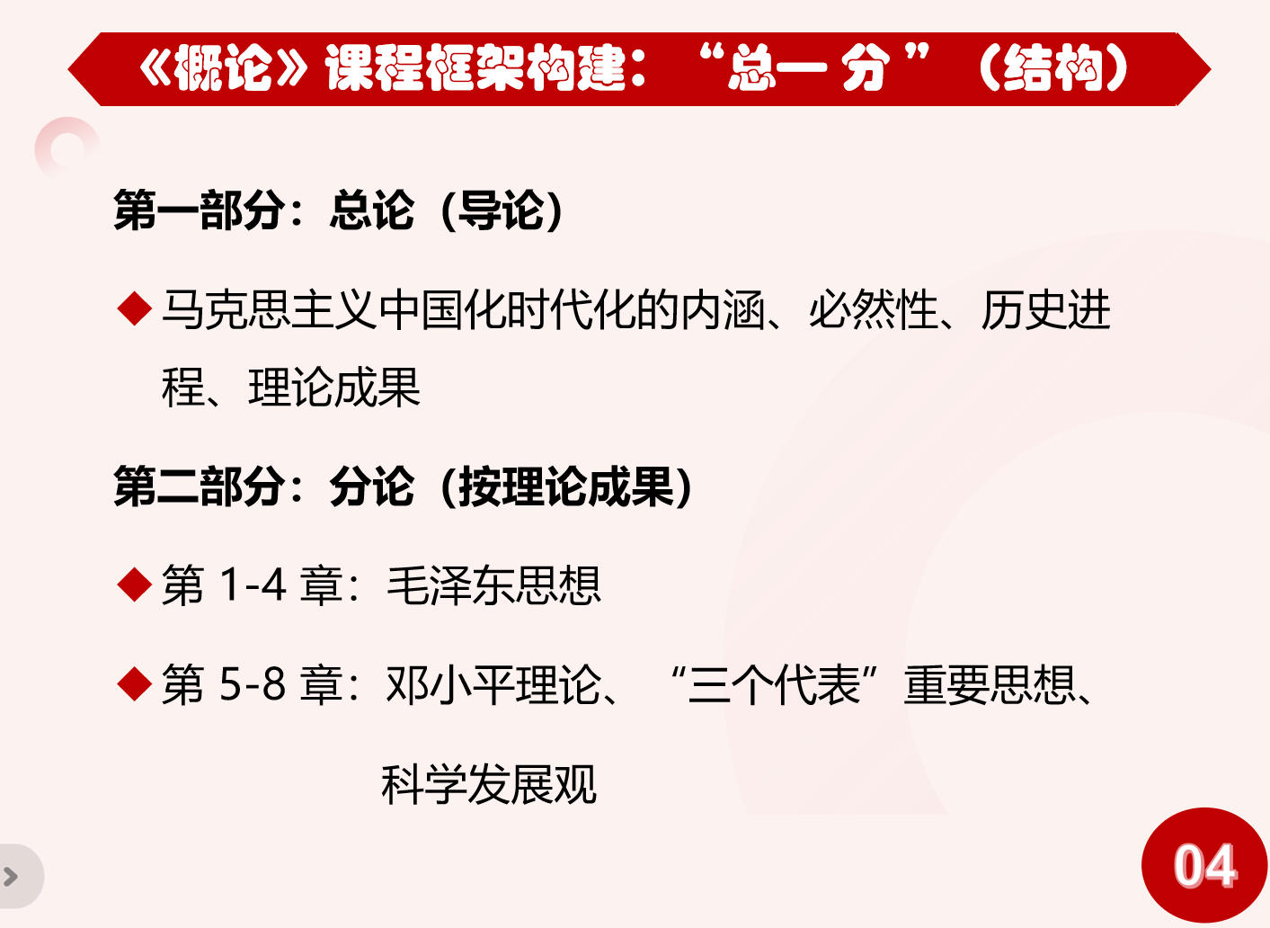 在框架构建与逻辑贯通部分,郭老师采用“总—分”结构拆解教材:总论部分把握马克思主义中国化时代化的内涵与进程,分论部分按理论成果系统学习。同时强调各理论成果一脉相承、与时俱进,坚守人民立场、实事求是,立足不同时代国情与主要矛盾形成理论创新,并总结出国情→矛盾→任务→理论→意义的通用答题逻辑,简化记忆、规范答题。